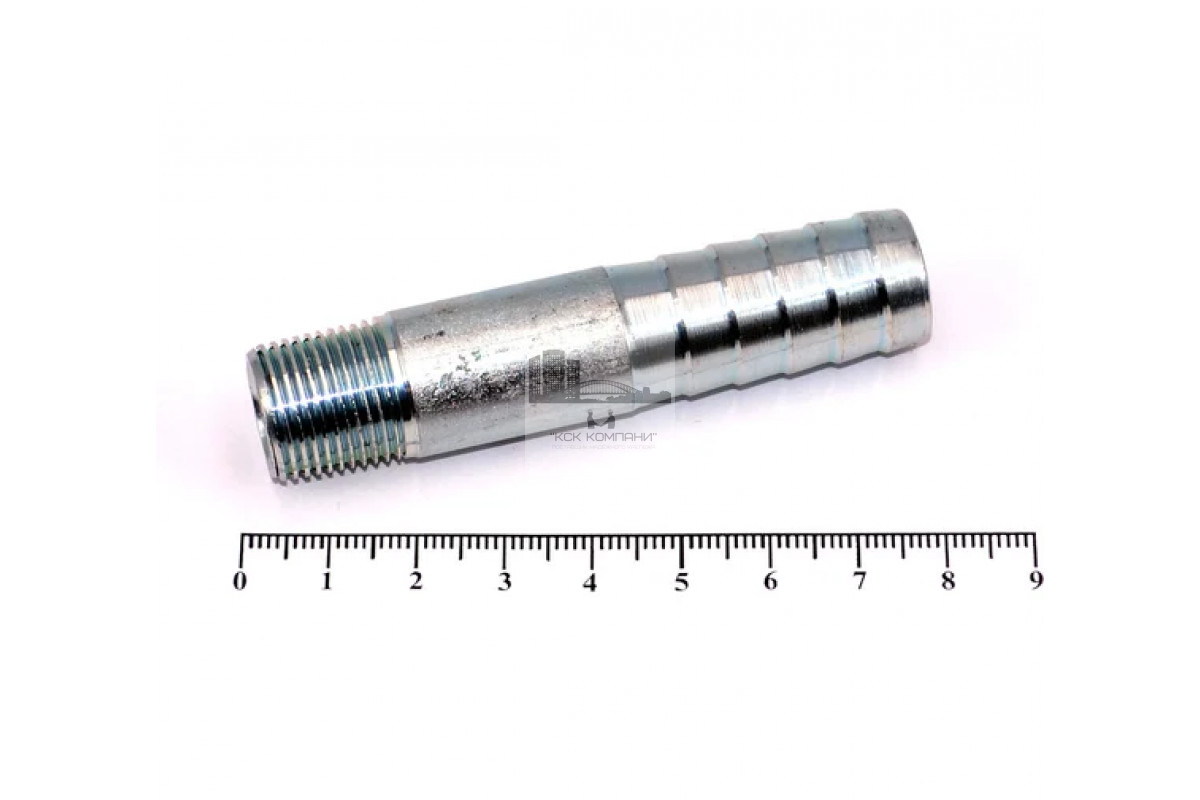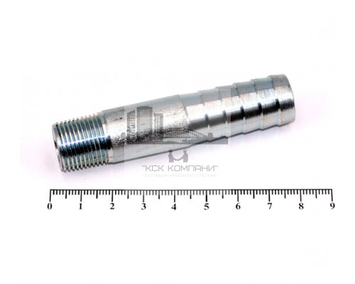 Применение: соединение представляет из себя прямой штуцер цилиндрической формы, с одной стороны наружная резьба, с другой насечка в виде "Елочки" под шланг. Применяется для подключения гибких рукавов к магистральным сетям или технологическому оборудованию. Уникальность данного соединения в одинаковом наружном диаметре резьбы и елочки, а также в отсутствии шестигранника между ними.