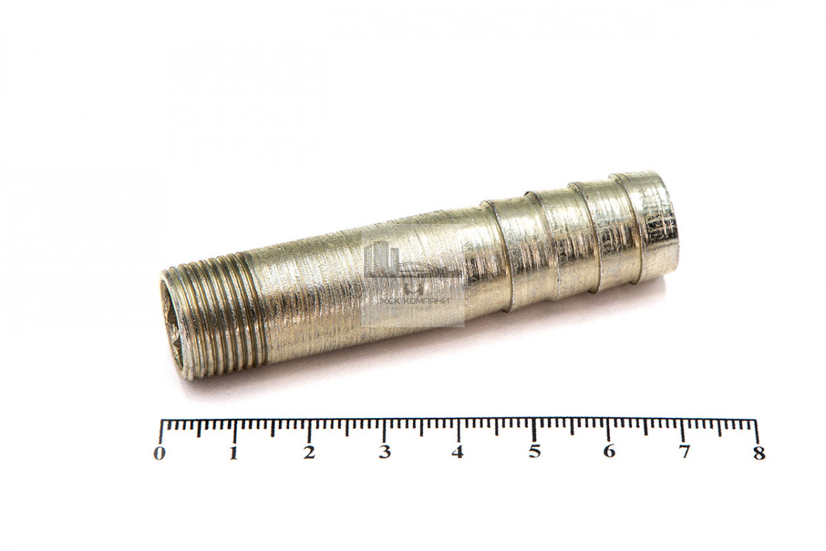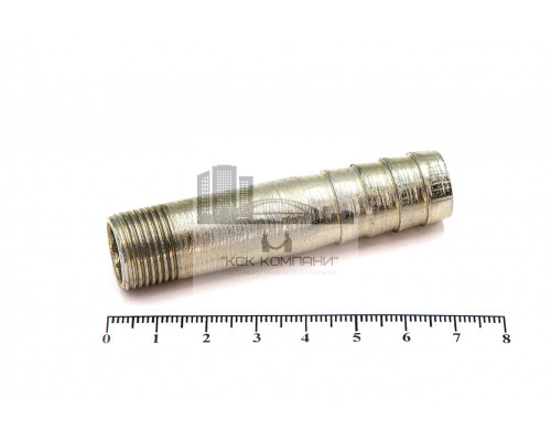 Применение: соединение представляет из себя прямой штуцер цилиндрической формы, с одной стороны наружная резьба, с другой насечка в виде "Елочки" под шланг. Применяется для подключения гибких рукавов к магистральным сетям или технологическому оборудованию. Уникальность данного соединения в одинаковом наружном диаметре резьбы и елочки, а также в отсутствии шестигранника между ними.
