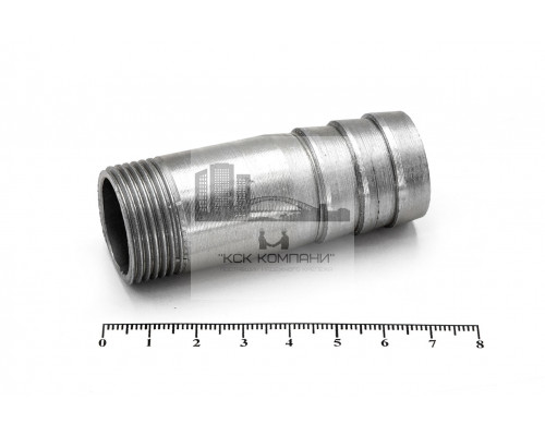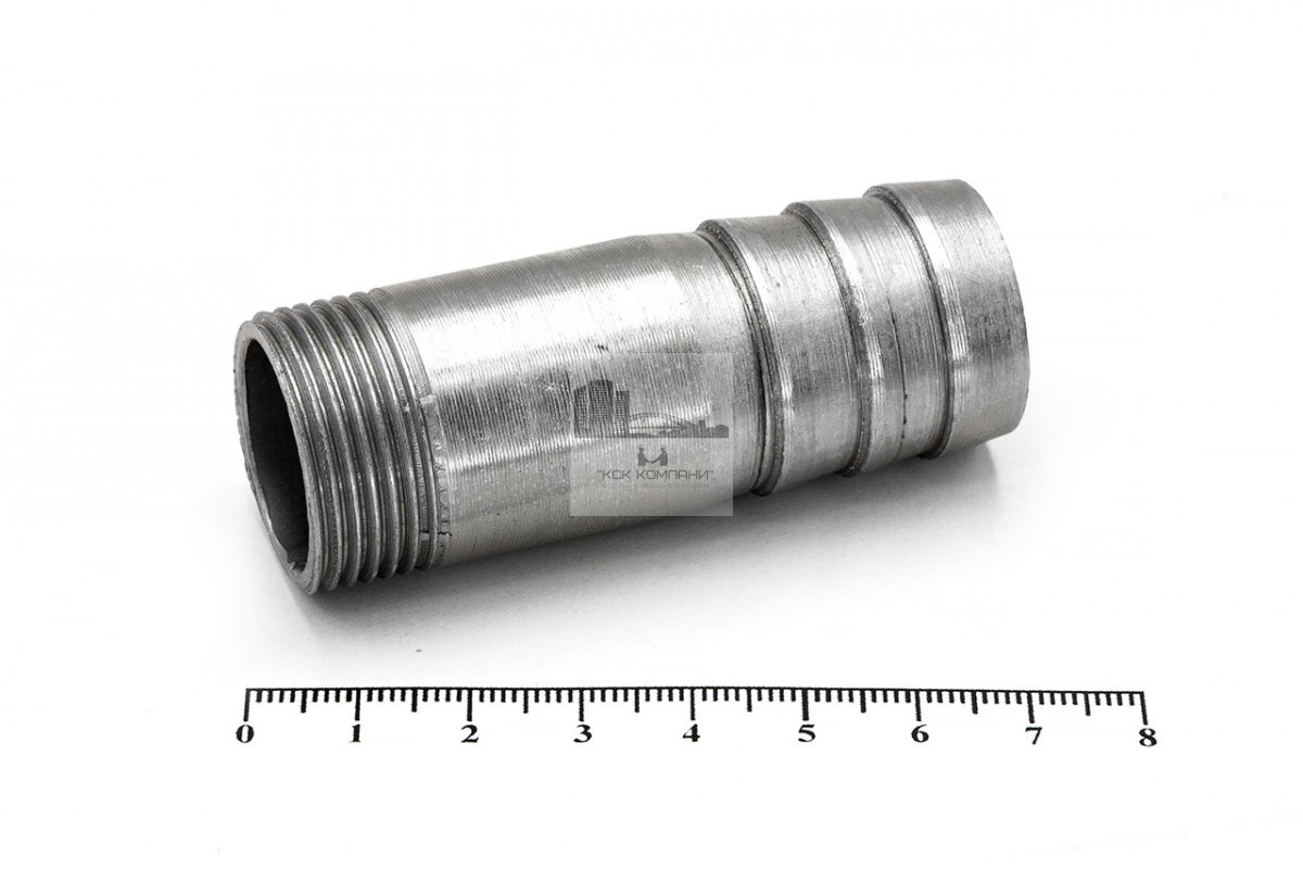 Применение: соединение представляет из себя прямой штуцер цилиндрической формы, с одной стороны наружная резьба, с другой насечка в виде "Елочки" под шланг. Применяется для подключения гибких рукавов к магистральным сетям или технологическому оборудованию. Уникальность данного соединения в одинаковом наружном диаметре резьбы и елочки, а также в отсутствии шестигранника между ними.