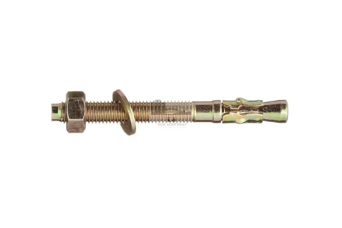 Особенности: Крепеж изготовлен из стали с защитным цинковым покрытием и дополнительным защитным слоем, образованным при пассивации. Конструктивно он состоит из подвижной втулки распорного элемента и шпильки с конусообразной нижней частью. На верхнюю резьбовую часть шпильки установлена шайба и накручена гайка шестигранной формы, при затяжке гайки конус распирает втулку анкера и приводит к его фиксации в материале основания. |