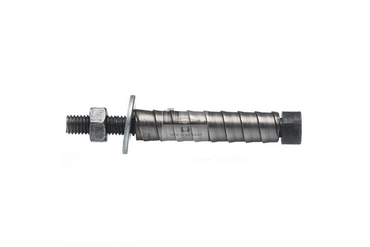 Особенности: Крепеж выполнен из стали с защитным оксидированным покрытием. Имеет вид стержня с резьбовой частью, на которую надета шайба и накручена шестигранная гайка. На остальную длину изделия накручен расклинивающий спиралевидный элемент. Монтаж крепежа осуществляется в заранее высверленное отверстие. Во время затяжки гайки витки расклинивающего элемента сжимаются и фиксируются со стенками несущего основания. |