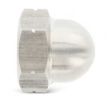 | Применение: Для резьбовых соединений, работающих без значительных нагрузок, применяют колпачковые гайки. Цель их использования – придать концам крепежных деталей эстетический внешний вид и исключить травмы от острых кромок резьбы. У колпачковой шестигранной гайки нет сквозного отверстия. У нее имеется глухое резьбовое гнездо, закрытое сферическим колпачком. Колпачковую гайку производят из коррозионно-стойкой стали, улучшенной никелем, молибденом и хромом. Она защитит резьбу крепежа от окисления, поэтому используется в приборостроении и пищевой и медицинской промышленности. |