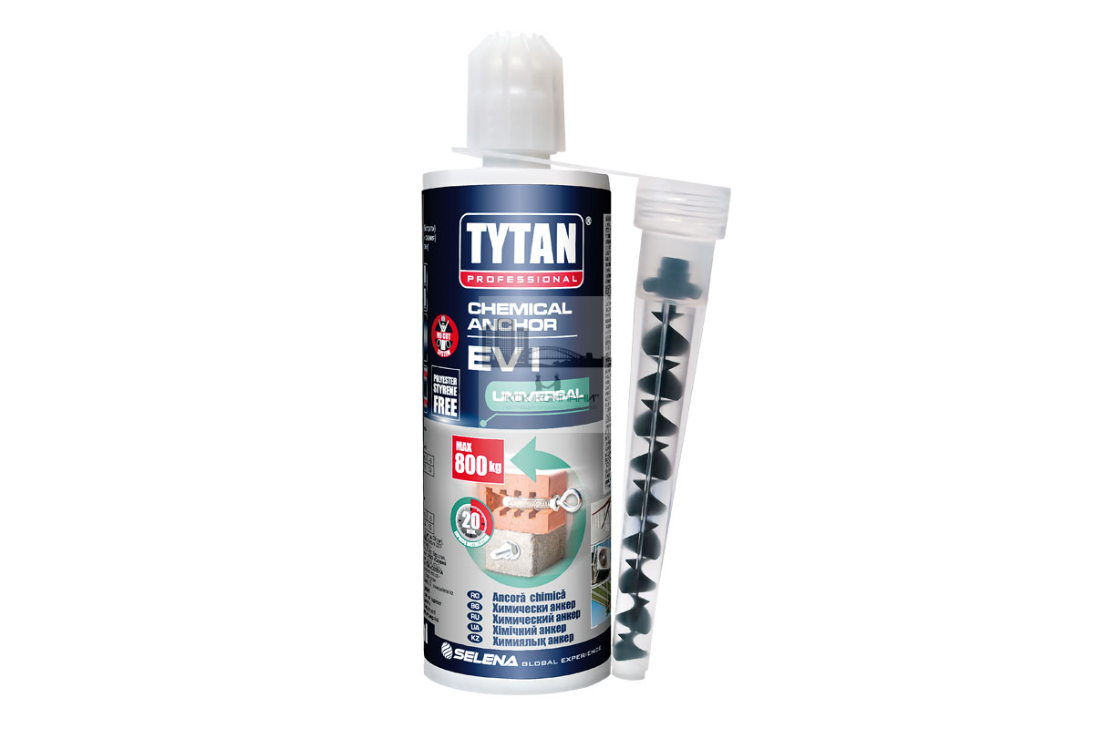 Для монтажа металлических элементов в твёрдое основание используется химический анкер TYTAN Professional EV I. Продукт характеризуется коротким временем схватывания и высоким уровнем адгезии. Химический анкер TYTAN Professional EV I произведён на базе полиэстерной смолы, обладает высокими экологическими и адгезионными свойствами.