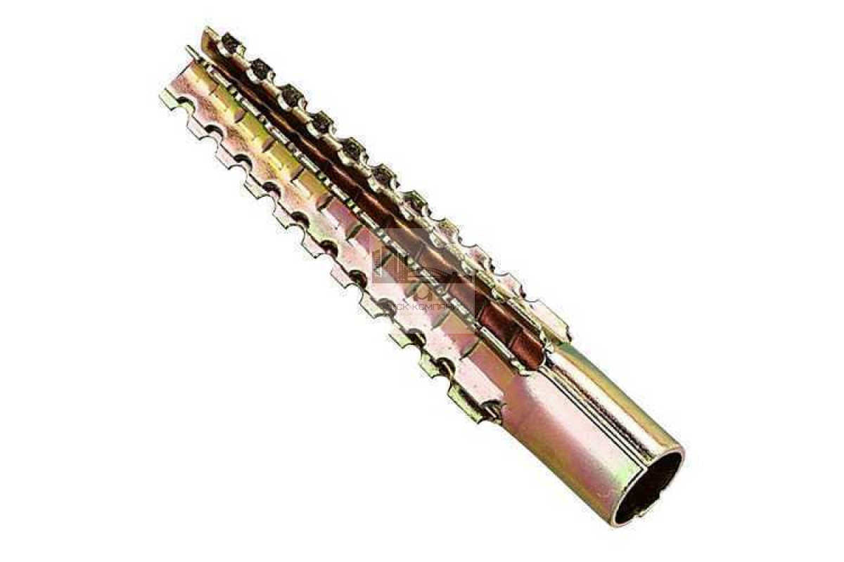 Особенности: Крепежный элемент выполнен с верхней частью в виде трубки, нижняя часть состоит из четырех распорных зон, оснащенных выступами, напоминающими шипы. Конструктивно изделие напоминает елочку. При установке изделия в строительные основания с пористой микроструктурой сверление монтажного отверстие не требуется: крепеж устанавливают ударным способом. |