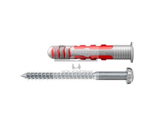 Особенности: Дюбель изготавливают из нейлона двух видов с различными механическими свойствами. Изделие это полая втулка с плоским фланцем, сделанная из полимера серого оттенка, с фигурными вставками и гребнями красного цвета. Серый нейлон более эластичен и поэтому он способен активировать оптимальный метод анкеровки – распирание, сворачивание либо завязывание в узел в зависимости от характера стенового материала для гарантированной надежности крепления. Гребни со вставками отличаются большей прочностью, поэтому они служат для предотвращения проворачивания дюбеля внутри скважины. Фланец дополнительно герметизирует отверстие в стене от проникновения влаги и одновременно плотно прилегает к поверхности прикрепляемой детали. Дополнительной герметизации от влаги добиваются за счет кольцевых канавок под фланцем. В качестве крепежа применяют шуруп из нержавеющей стали с винтовой нарезкой на ⅔ длины, заостренным концом и полукруглой шляпкой со звездообразным шлицем типа TORX. |