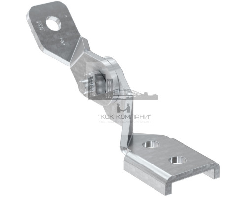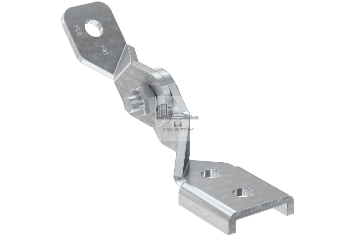 Особенности: Конструкция соединительного элемента состоит из двух плоских деталей, собранных при помощи изогнутой проушины с отверстием, в которое помещен короткий болт М12, имеющий полную резьбу и зажатый с помощью гайки. Наличие такой вращающейся оси делает возможным отрегулировать угол установки растяжки в диапазоне 30-65°. Материалом для изготовления соединителя служит оцинкованная сталь с толщиной 6 мм. Длина деталей равна 95 и 118 мм соответственно. Для фиксации соединительного элемента к шинам–болтом со скользящей гайкой, а к панели перекрытия – анкером, в его деталях просверлены три отверстия диаметром 14 мм. |