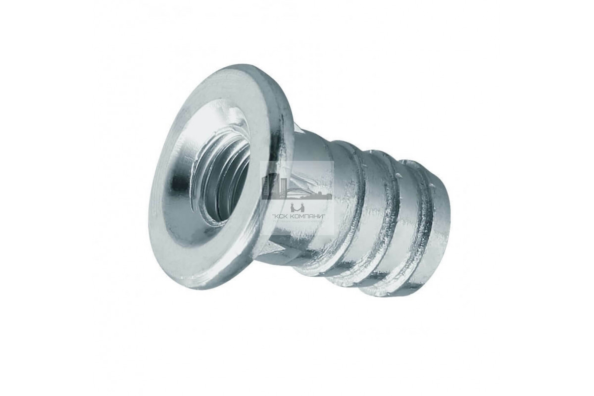 Особенности: Забивная гайка с круглым фланцем предназначена для создания крепёжной точки с метрической резьбой при соединении различных конструктивных элементов мебели, изготовленных из дерева, фанеры или ДСП. Фланец забивной мебельной гайки служит для перераспределения усилия на поверхность соединяемой детали, а для предотвращения прокручивания при стягивании под фланцем сделаны специальные выступы. |