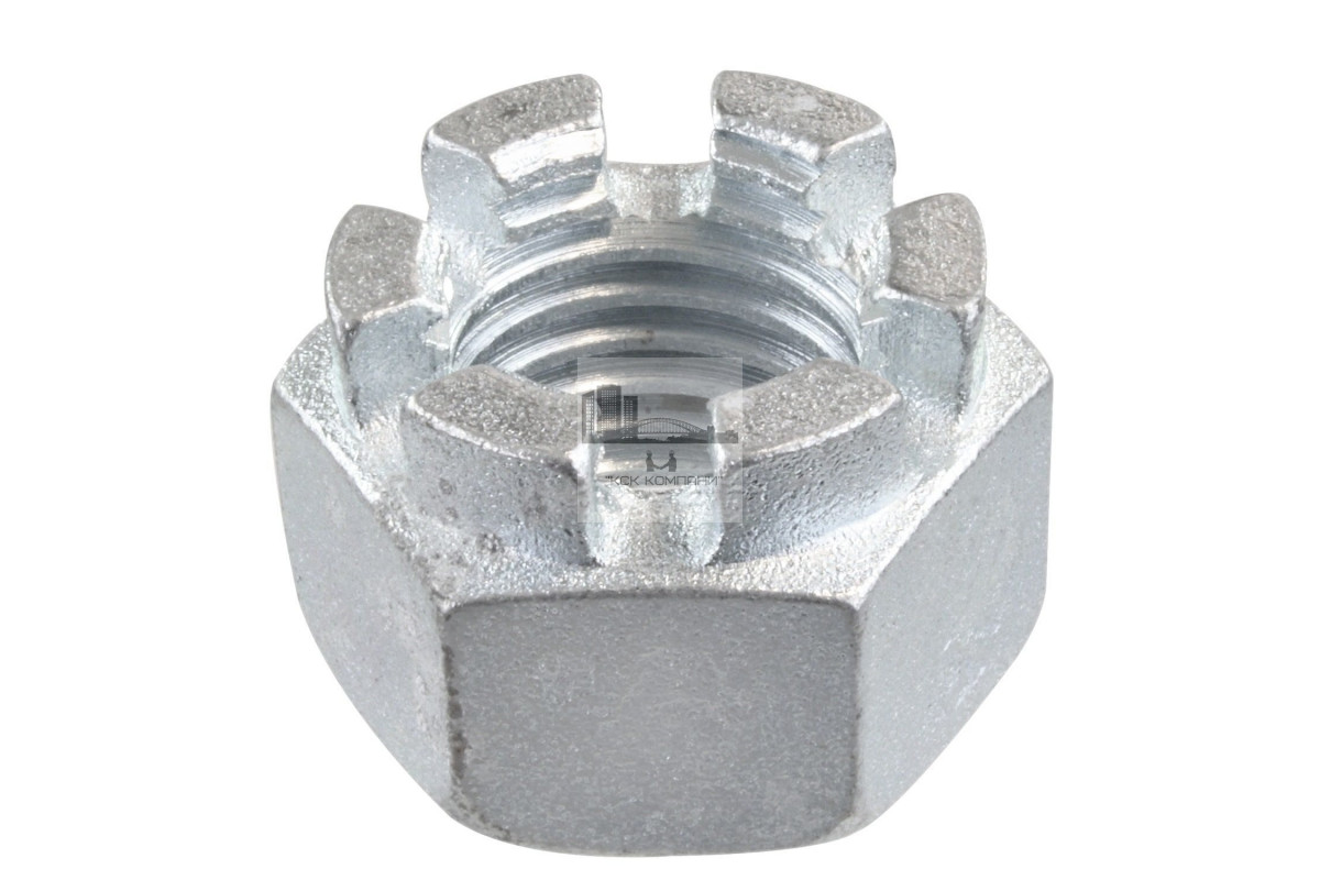 Корончатая гайка выполнена из стали с оцинкованным покрытием, что защищает её от коррозии. Крепёжный элемент востребован в машиностроении, приборостроении и других производственных сегментах. Метиз обеспечивает надёжное соединение, может использоваться вместе с шайбами, болтами и шпильками.