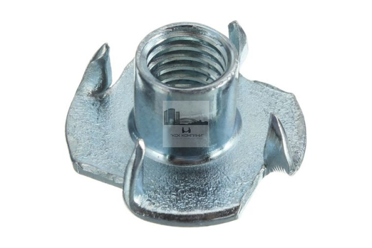 Гайка врезная DIN 1624 характеризуется наличием зауженных усиков, которые предотвращают прокручивание и выпадение из деревянного основания. Большая площадь охвата метиза обеспечивает равномерное распределение нагрузки. Монтаж гайки мебельной DIN 1624 предполагает подготовку основания. Забивается крепёж при помощи молотка.