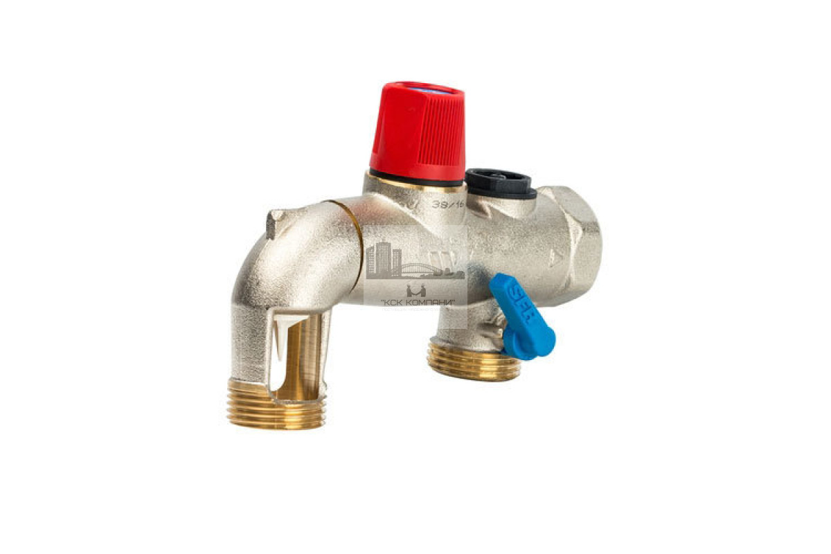Группа безопасности мембранного бака SFR Предохранительный клапан. Проверочный порт работы обратного клапана. Встроенный обратный клапан (защита системы питьевого водоснабжения от обратного тока горячей воды). Запорный шаровой кран с ходом закрытия 90°. Направляющая для воды предотвращает разбрызгивание. Сбросная насадка для подключения к дренажной линии: вращаемый сброс с разрывом струи. Техническая характеристика Давление срабатывания, бар: 7 Размер клапана : 1" HР Материал изготовления: латунь