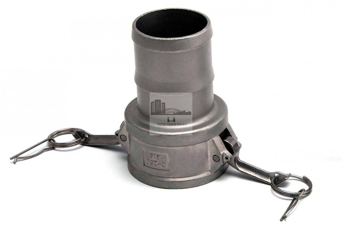 С: тип камлока - муфта со штуцером типа "ёлочка" и приёмной частью "мама" с фиксаторами кулачкового типа