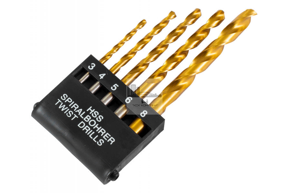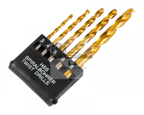 Набор нитридтитановых сверл по металлу - состав набора: 3 мм, 4 мм, 5 мм, 6 мм, 8 мм; пластиковый бокс.