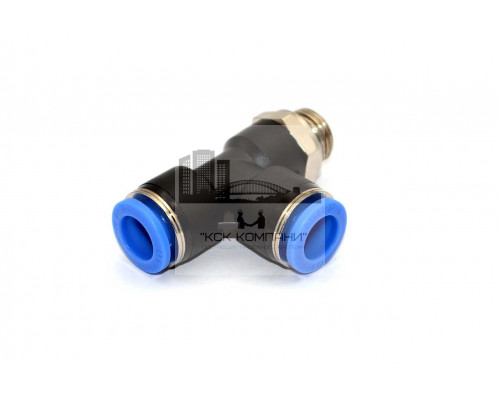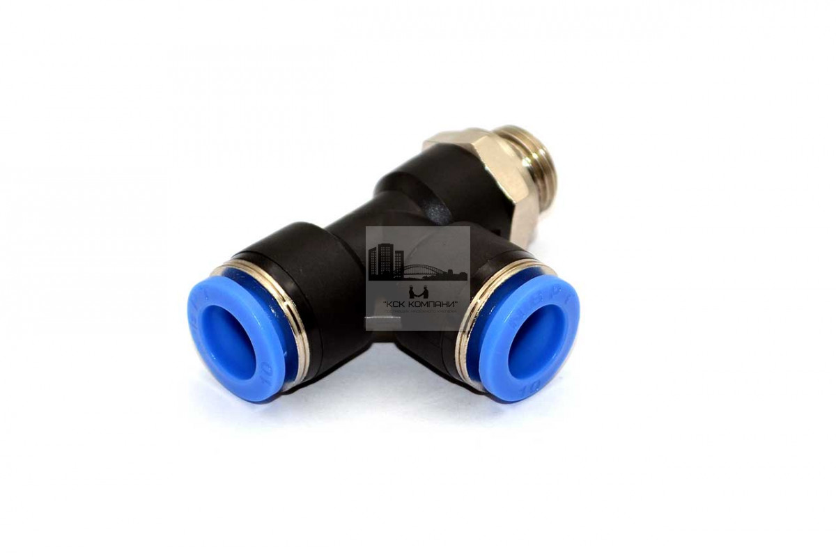 PST – модель фитинга (трубка-трубка-резьба): Т-образный фитинг с наружной резьбой с одной стороны и нажимным цанговым соединением с двух сторон