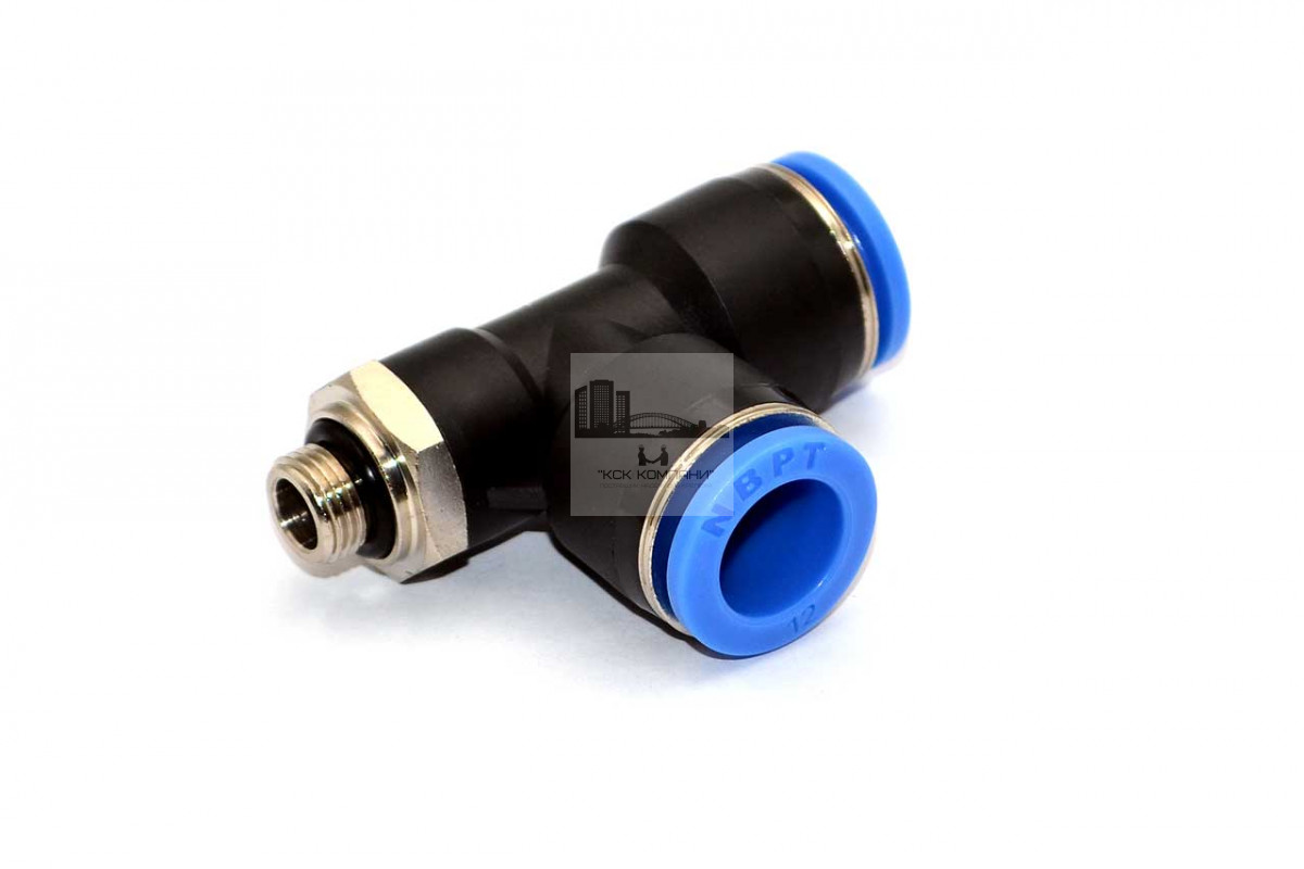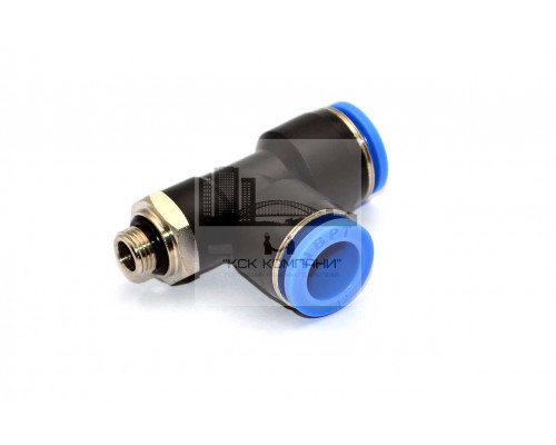 PST – модель фитинга (трубка-трубка-резьба): Т-образный фитинг с наружной резьбой с одной стороны и нажимным цанговым соединением с двух сторон