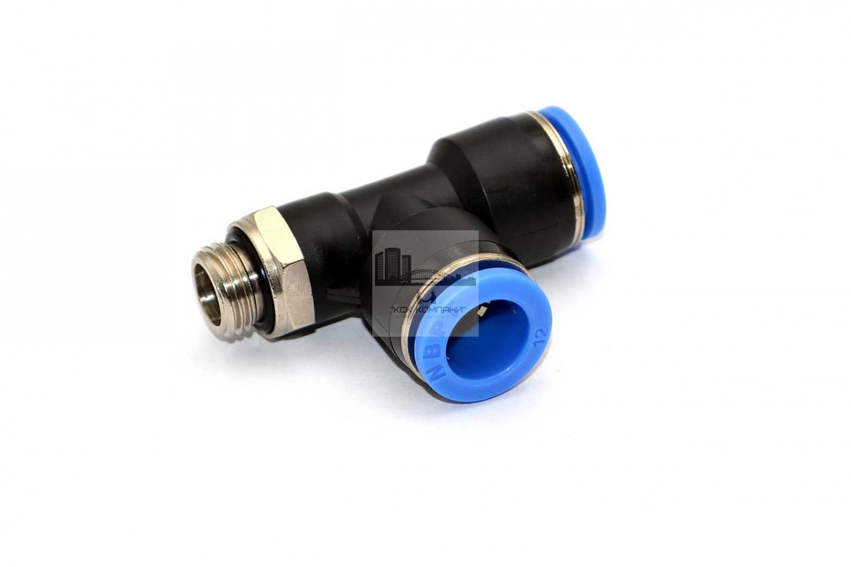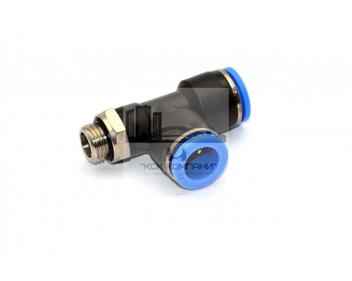 PST – модель фитинга (трубка-трубка-резьба): Т-образный фитинг с наружной резьбой с одной стороны и нажимным цанговым соединением с двух сторон