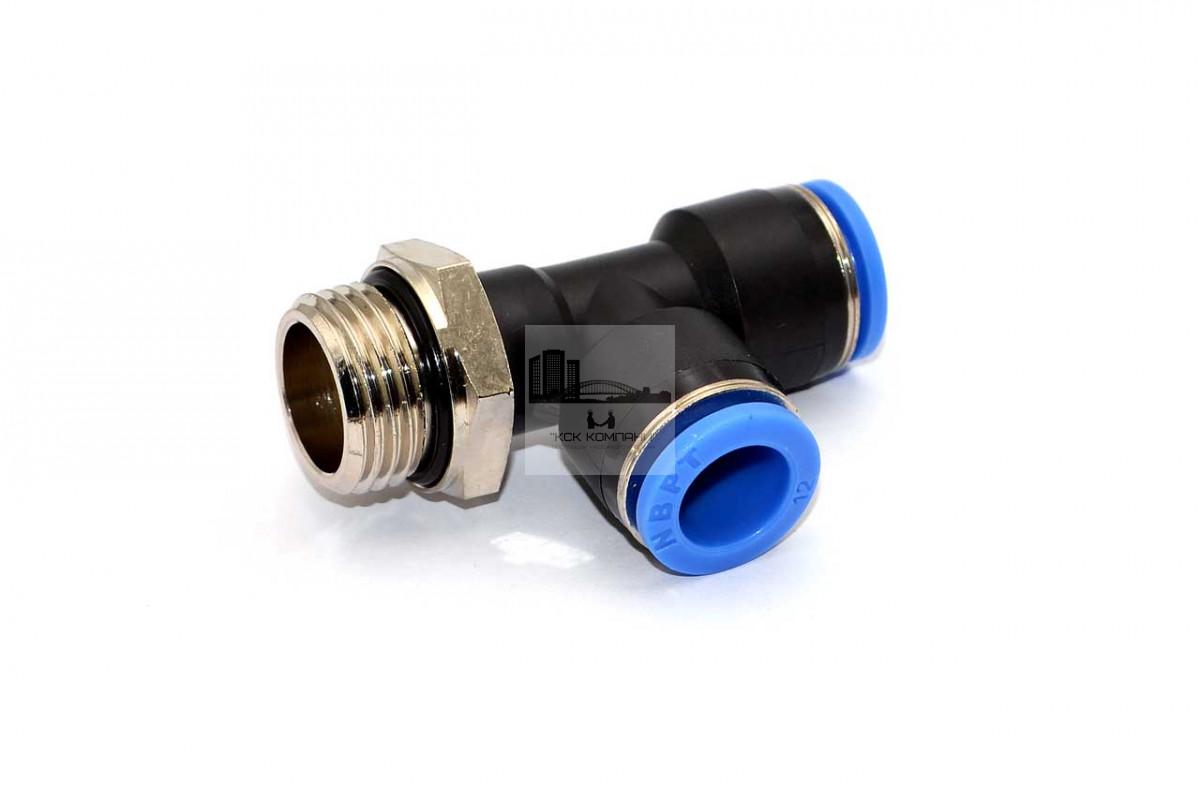 PST – модель фитинга (трубка-трубка-резьба): Т-образный фитинг с наружной резьбой с одной стороны и нажимным цанговым соединением с двух сторон