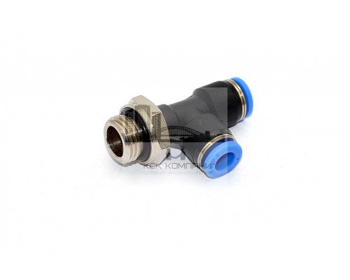 PST – модель фитинга (трубка-трубка-резьба): Т-образный фитинг с наружной резьбой с одной стороны и нажимным цанговым соединением с двух сторон