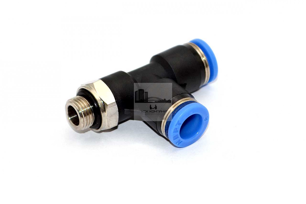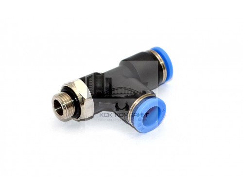 PST – модель фитинга (трубка-трубка-резьба): Т-образный фитинг с наружной резьбой с одной стороны и нажимным цанговым соединением с двух сторон