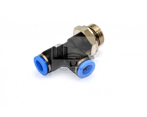 PST – модель фитинга (трубка-трубка-резьба): Т-образный фитинг с наружной резьбой с одной стороны и нажимным цанговым соединением с двух сторон