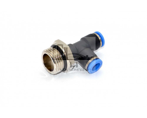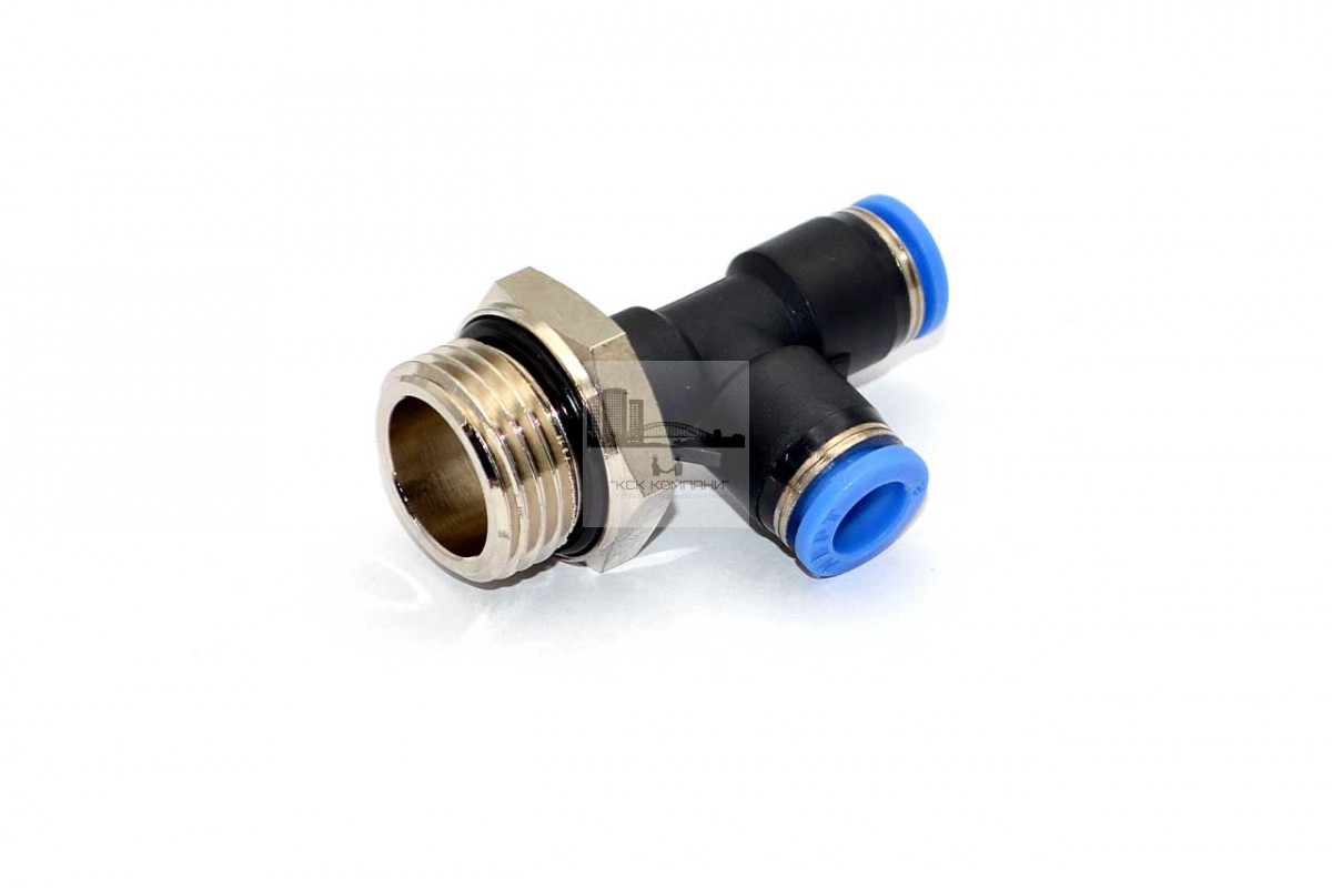 PST – модель фитинга (трубка-трубка-резьба): Т-образный фитинг с наружной резьбой с одной стороны и нажимным цанговым соединением с двух сторон