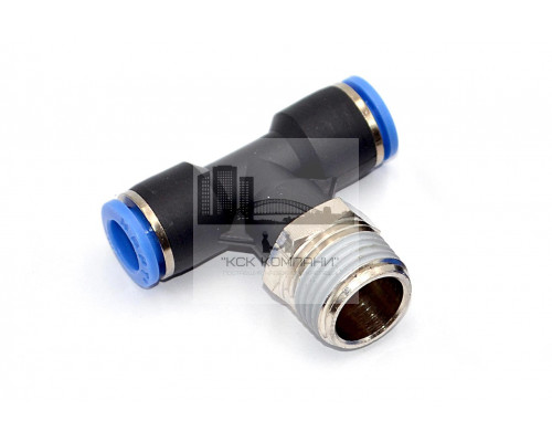 PТ – модель фитинга (трубка-резьба): Т-образный фитинг с наружной резьбой с одной стороны и нажимным цанговым соединением с других сторон