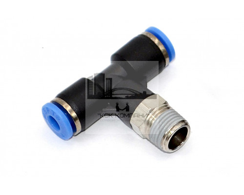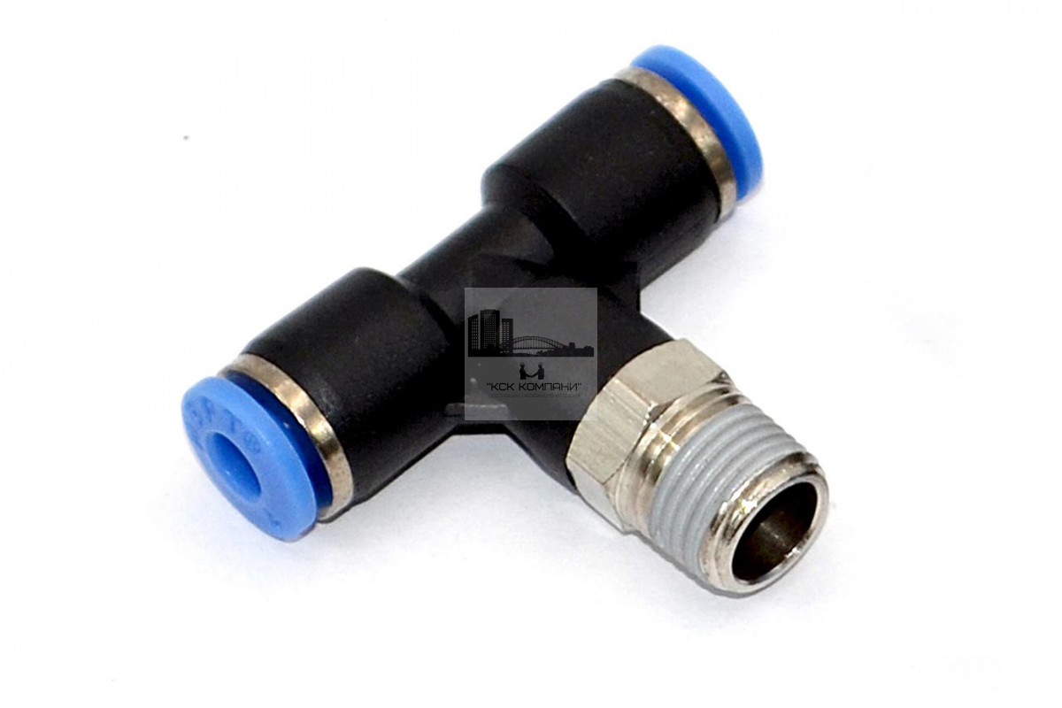 PТ – модель фитинга (трубка-резьба): Т-образный фитинг с наружной резьбой с одной стороны и нажимным цанговым соединением с других сторон