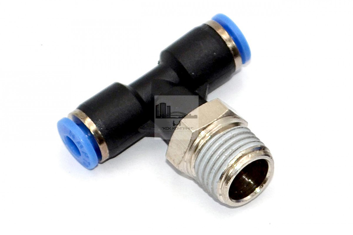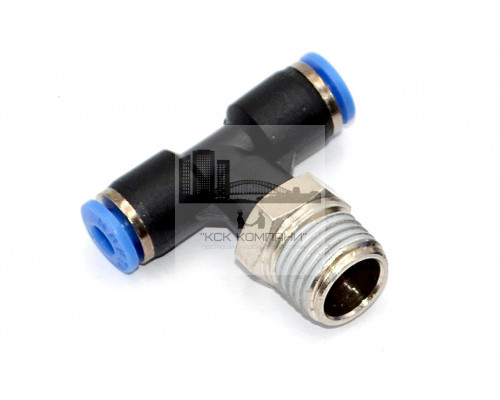 PТ – модель фитинга (трубка-резьба): Т-образный фитинг с наружной резьбой с одной стороны и нажимным цанговым соединением с других сторон