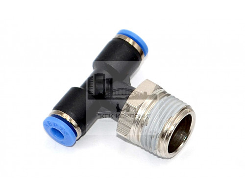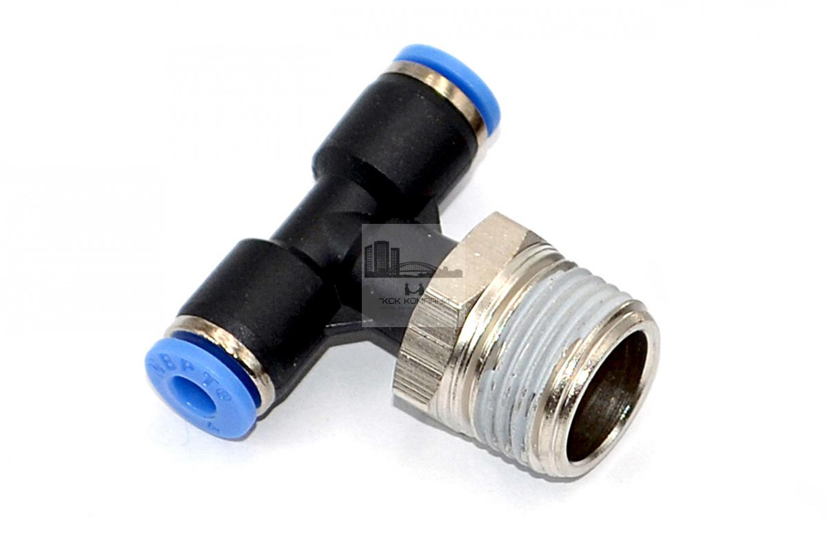PТ – модель фитинга (трубка-резьба): Т-образный фитинг с наружной резьбой с одной стороны и нажимным цанговым соединением с других сторон
