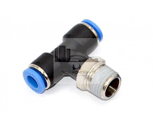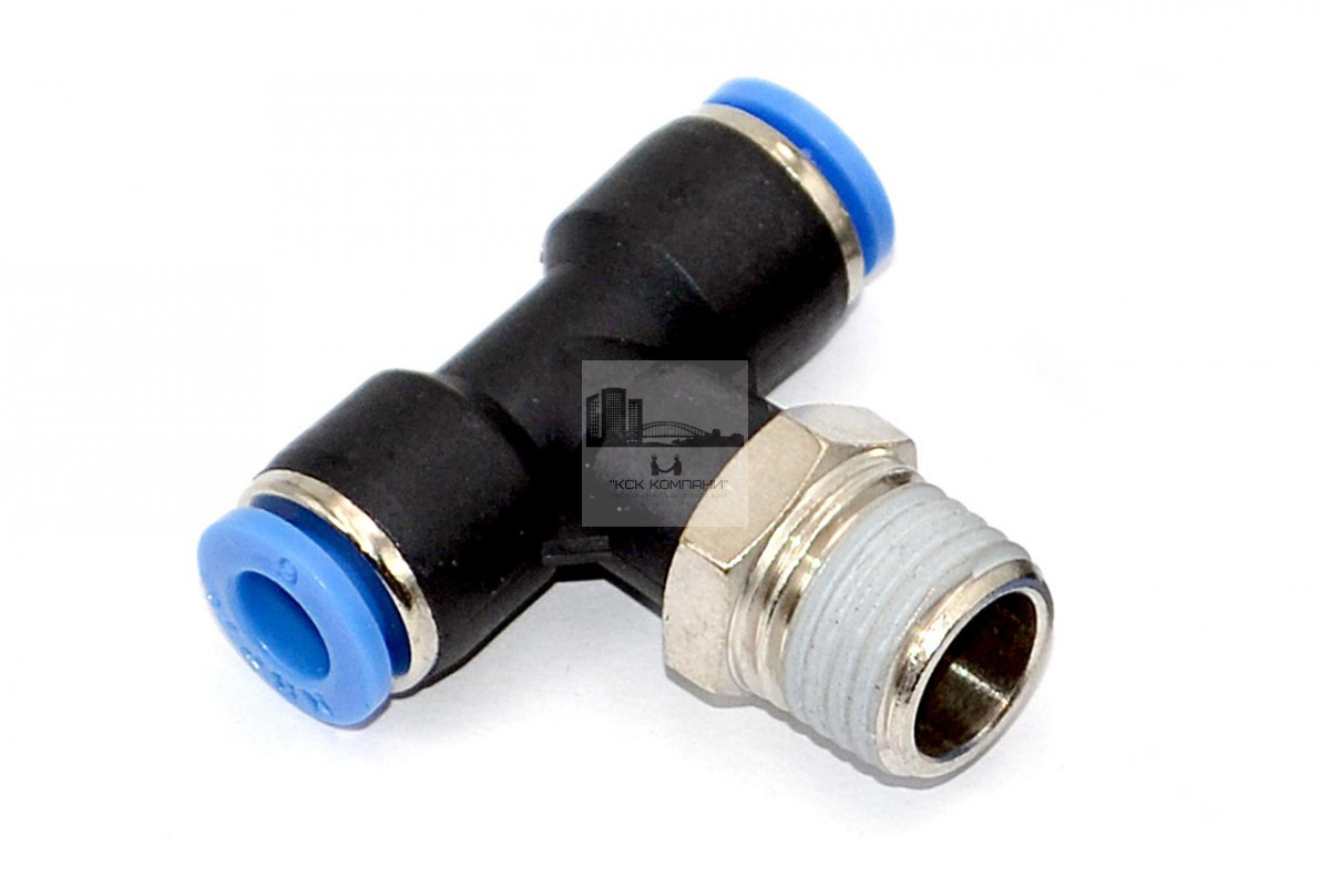 PТ – модель фитинга (трубка-резьба): Т-образный фитинг с наружной резьбой с одной стороны и нажимным цанговым соединением с других сторон