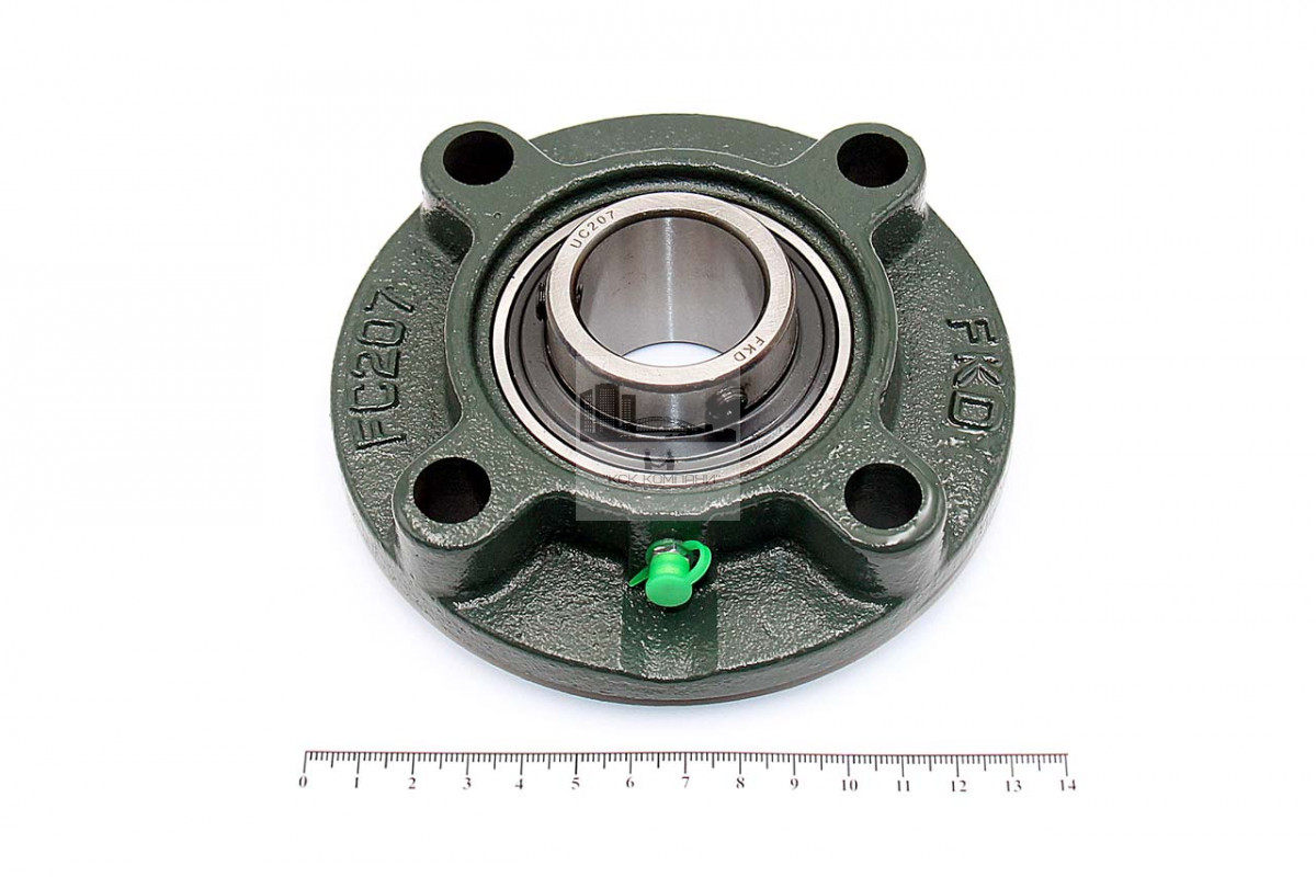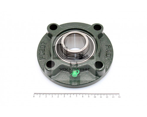 Подшипник имеет отверстия и канавку для смазки, корпус комплектуется пресс-маслёнкой. Направление воспринимаемых нагрузок - радиальное и осевое в обе стороны. Монтаж на валу удобен и прост. Установлен в корпус FC фланцевого типа..
