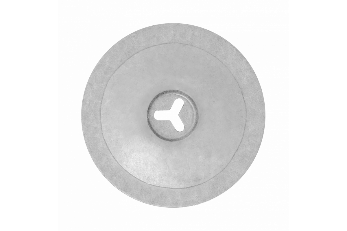 - Круглая шайба, выполненная из алюминиево-цинкового сплава, обеспечивает отличную стойкость к действию коррозии. Форма и тип шайбы обеспечивают возможность легкого монтажа с помощью соответствующих шурупов, используемых при жестком монтаже элементов твердой кровельной изоляции.