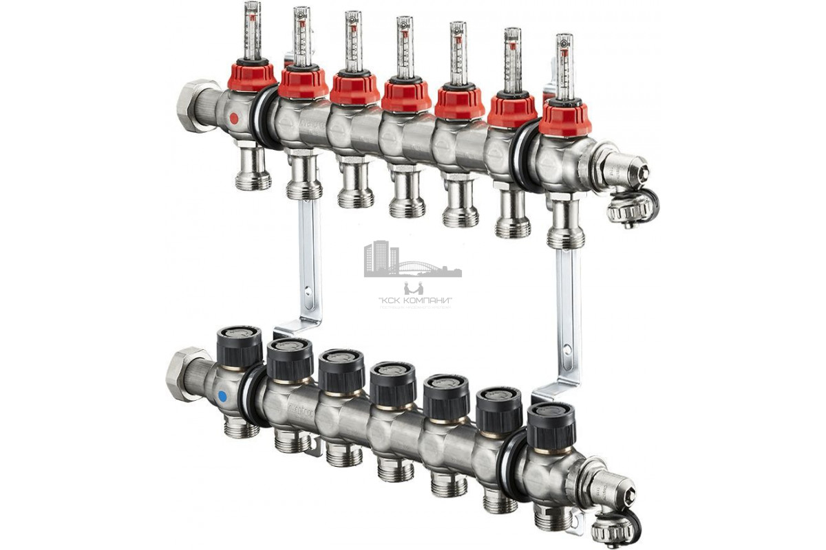 Распределительная гребенка Oventrop "Multidis SF" со встроенными ротаметрами на 7 контуров 1404357, нержавеющая сталь. Коллектор смонтирован с кранами для заполнения и опорожнения с воздухоспускными и концевыми пробками. Подающая температура до 70°с.