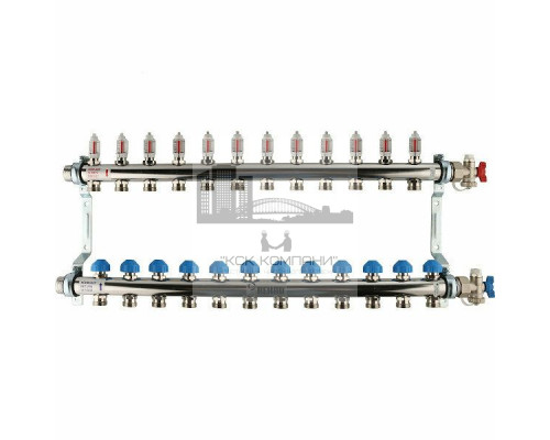 REHAU коллектор HKVD из нержавеющей стали (с расходомерами) включает в себя, 2 распределительные трубы 1" (наружная резьба), для подачи и отвод а теплоносителя с возможностью подключения с обеих сторон, смонтированы на звукоизолирующих оцинкованных кронштейнах соответствующих требованиям DIN 4109, с расходомерами на подающей трубе с запорными вентилями на обратной трубе, для подключения сервопривода резьба M 30 x 1.5, концевик коллектора с накидной гайкой 1" , уплотнительная прокладка, воздухоотводчик 3/8" и кран для заполнения 1/2", набор крепежных деталей, маркировочные таблички,