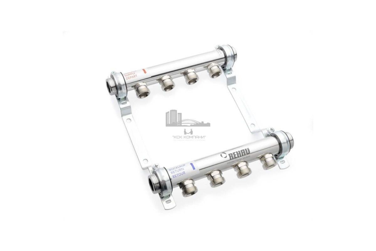 Rehau Распределительный коллектор HL V из нержавеющей стали коллекторы предназначены для разветвления контуров систем радиаторного отопления, нержавеющая сталь, в комплект входят подающий и обратный коллекторы, с возможностью двухстороннего присоединения 1” (наружная резьба) под плоское уплотнение, 2 никелированные заглушки 1” ВН. резьба со встроенными воздушными клапанами и уплотнением, ниппельные отводы под резьбозажимные соединения Rehau евроконус 3/4“ , коллекторы установлены на звукоизолированные оцинкованные кронштейны, резьбозажимные соединения Rehau евроконус 3/4” заказываются отдельно;