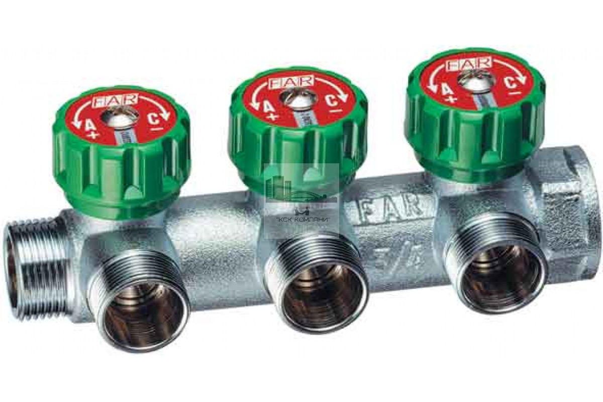 Регулирующий проходной коллектор FAR ВР-НР 1" б/гаек М24х19 с 3 отводами (метрика) FK 3850 C1 применяется для равномерного распределения воды от основного трубопровода к различным приборам в системах отопления и водоснабжения без потери напора воды. Благодаря удобному расположению управляющей ручки обслуживание не требует особых усилий и дополнительного оборудования. Ручки регулирующих вентилей оснащены сине-красными вкладышами с "оконцами", благодаря которым можно установить дополнительные вкладыши с наименованием помещения либо подключенного оборудования.