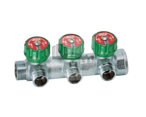 Регулирующий проходной коллектор FAR ВР-НР 1"х1/2" с 3 отводами FK 3822 112 TP применяется для равномерного распределения воды от основного трубопровода к различным приборам в системах отопления и водоснабжения без потери напора воды. Благодаря удобному расположению управляющей ручки обслуживание не требует особых усилий и дополнительного оборудования. Ручки регулирующих вентилей оснащены сине-красными вкладышами с "оконцами", благодаря которым можно установить дополнительные вкладыши с наименованием помещения либо подключенного оборудования.
