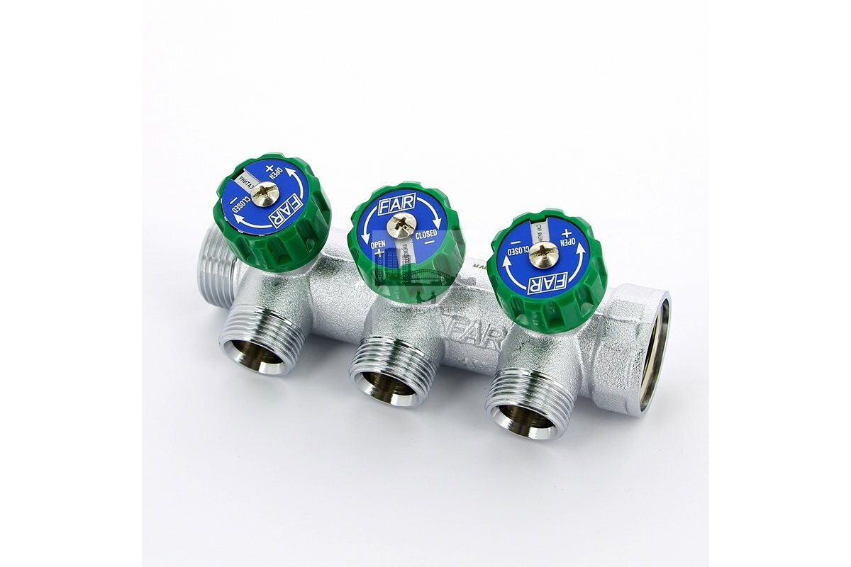Регулирующий проходной коллектор FAR ВР-НР 1"-3/4" с 3 отводами FK 3822 134 (EUR) применяется для равномерного распределения воды от основного трубопровода к различным приборам в системах отопления и водоснабжения без потери напора воды. Благодаря удобному расположению управляющей ручки обслуживание не требует особых усилий и дополнительного оборудования. Ручки регулирующих вентилей оснащены сине-красными вкладышами с "оконцами", благодаря которым можно установить дополнительные вкладыши с наименованием помещения либо подключенного оборудования.