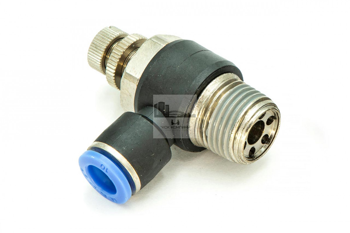 NSC – модель фитинга (трубка-резьба-регулятор): L-образный с наружной резьбой с одной стороны и нажимным цанговым соединением с другой стороны и регулятором воздуха.