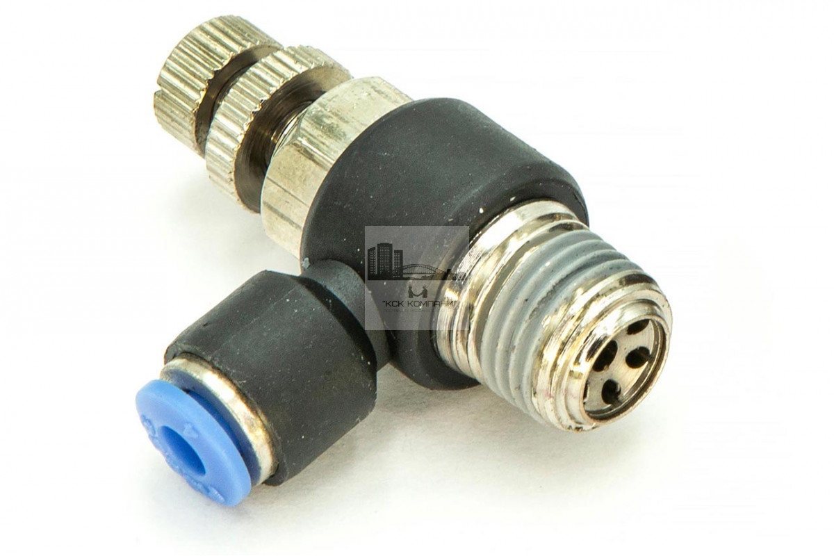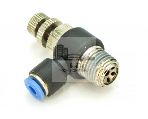 NSC – модель фитинга (трубка-резьба-регулятор): L-образный с наружной резьбой с одной стороны и нажимным цанговым соединением с другой стороны и регулятором воздуха.