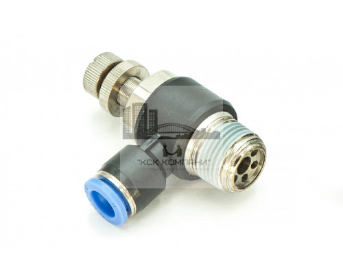 NSC – модель фитинга (трубка-резьба-регулятор): L-образный с наружной резьбой с одной стороны и нажимным цанговым соединением с другой стороны и регулятором воздуха.