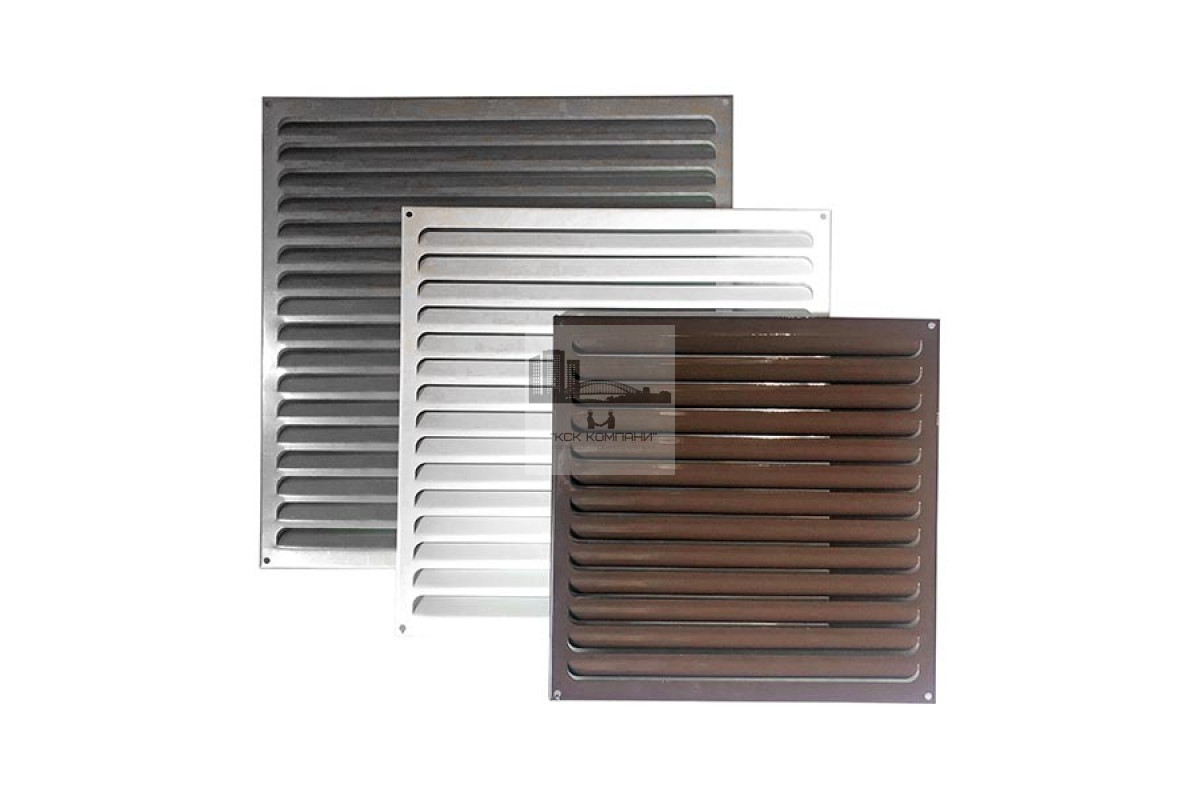 Воздухозаборная решетка металлическая накладная размером 450*450 мм. для внутреннего или наружного монтажа. Изготовлена из оцинкованной стали, окрашенная в белый или коричневый цвет