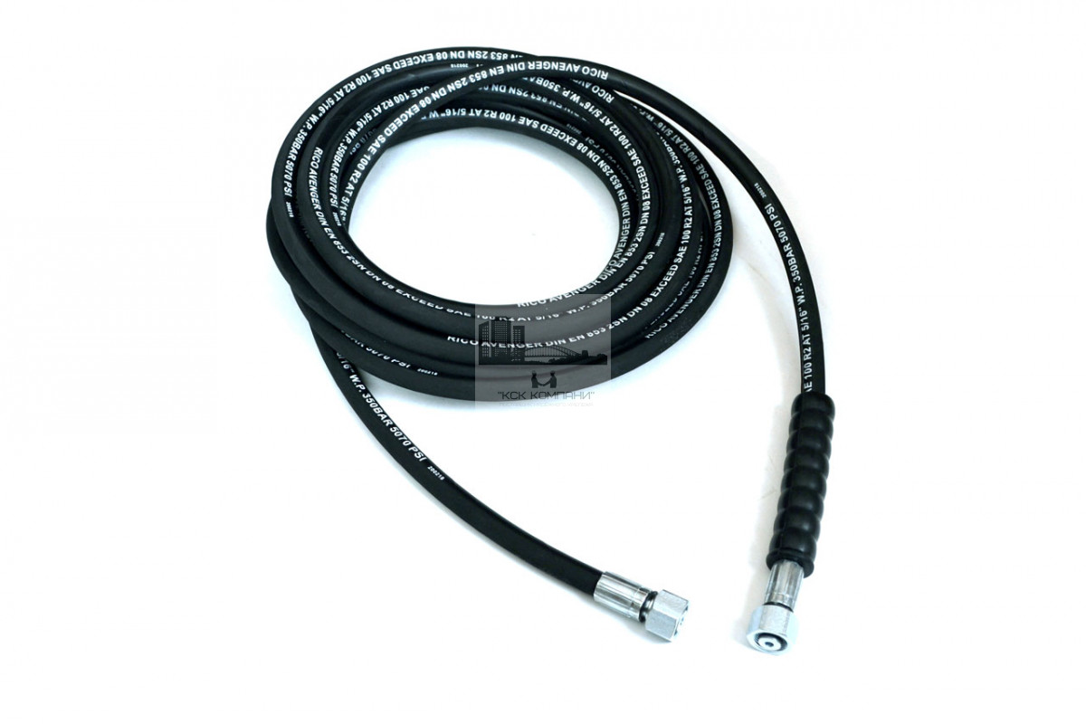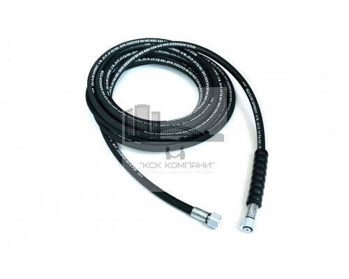 Рукав с двух сторон обжат фитингами DKF-W (washclean kercher) c метрической резьбой М22х1.5 и металлической гайкой для соединения с моечным аппаратом. С одной стороны имеет защиту от изгиба для присоединения к моечному пистолету.