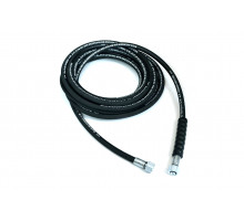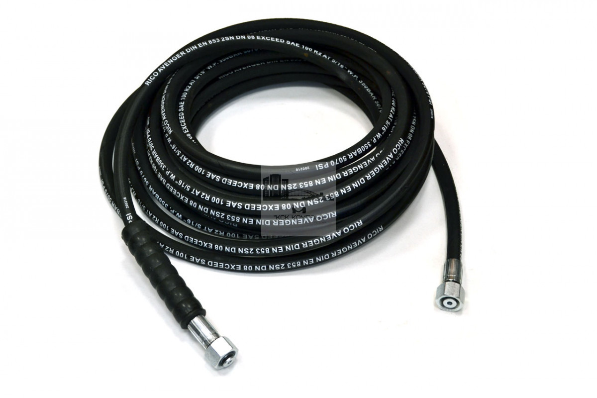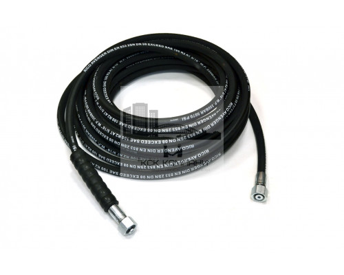 Рукав с двух сторон обжат фитингами DKF-W (washclean kercher) c метрической резьбой М22х1.5 и металлической гайкой для соединения с моечным аппаратом. С одной стороны имеет защиту от изгиба для присоединения к моечному пистолету.