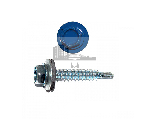 Для установки профилированного листа к деревянной обрешётке используется окрашенный саморез кровельный RAL 5005. Винтовой элемент оснащен EPDM уплотнителем, что гарантирует плотную фиксации кровли к основанию и минимизирует риск попадания влаги. Прокладка также невосприимчива к резким изменениям температур.