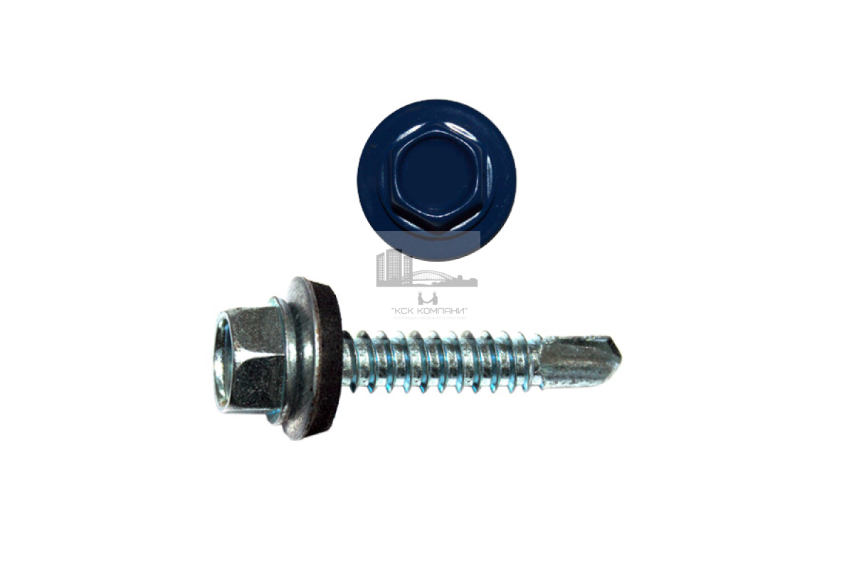Для установки профилированного листа к деревянной обрешётке используется окрашенный саморез кровельный RAL 5010. Винтовой элемент оснащен EPDM уплотнителем, что гарантирует плотную фиксации кровли к основанию и минимизирует риск попадания влаги. Прокладка также невосприимчива к резким изменениям температур.