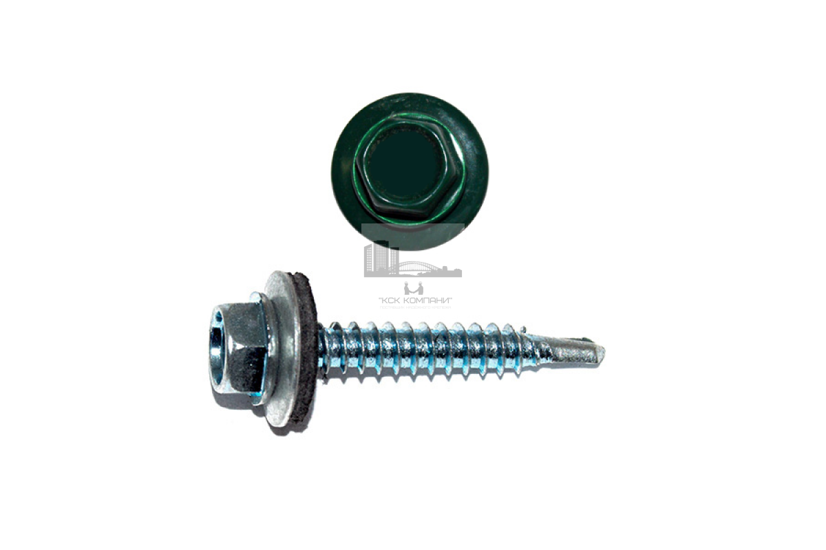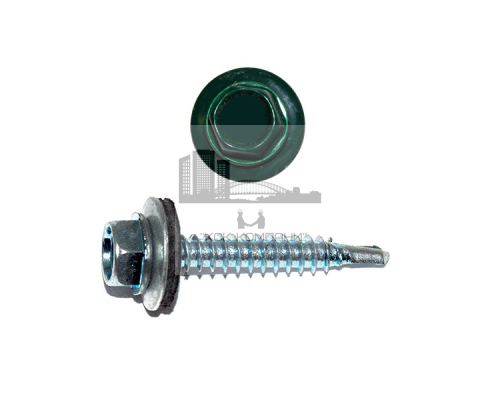Для установки профилированного листа к деревянной обрешётке используется окрашенный саморез кровельный RAL 6005. Винтовой элемент оснащен EPDM уплотнителем, что гарантирует плотную фиксации кровли к основанию и минимизирует риск попадания влаги. Прокладка также невосприимчива к резким изменениям температур.