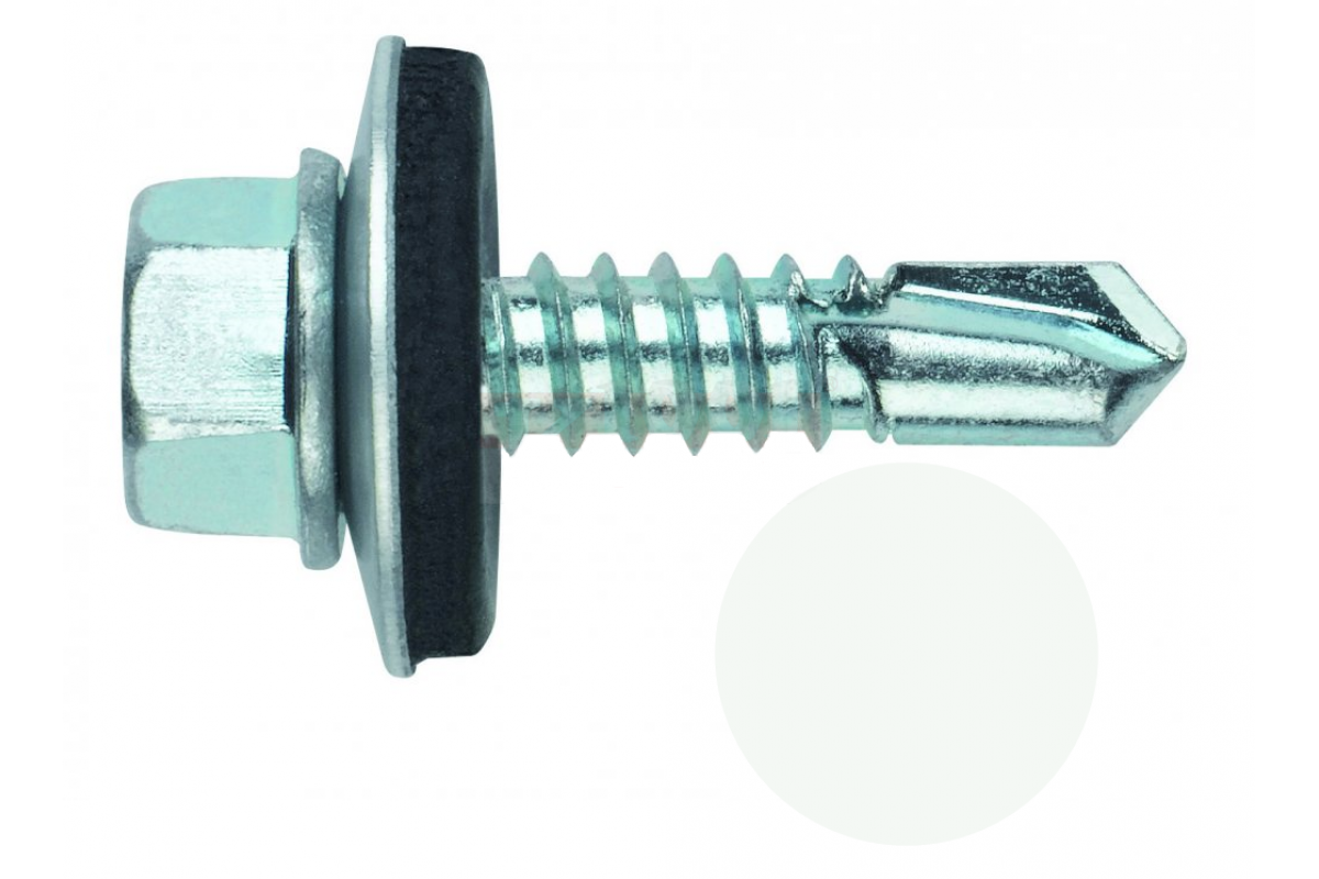 Особенности:Изделие представляет собой стержень со сверлоконечным окончанием, имеет шестигранную головку с резиновым уплотнителем. Резиновая шайба способствует герметичности соединения, не позволяет проникать влаге и пыли. Оцинкованная шайба увеличивает площадь контакта метиза с присоединяемой поверхностью и сохраняет ее ровной без деформации. Изделие окрашено в цвет RAL9003 — это "белый сигнальный". |
