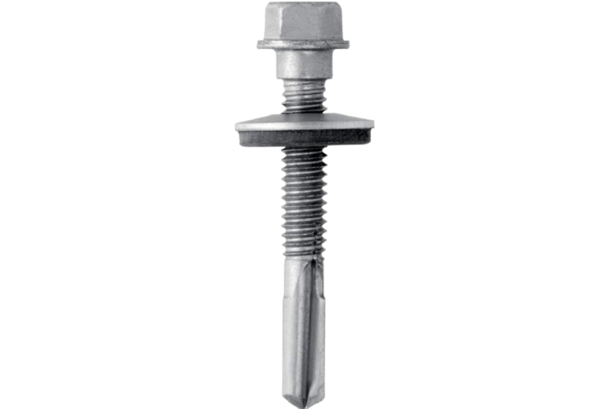Особенности: Конструктивно изделие состоит из стержня, с удлиненным сверлом и резьбой, а также шестигранной головки с прессшайбой и уплотняющей прокладкой. Такая форма сверла позволяет прикреплять материалы к основаниям с толщиной до 12,5 мм. Прессшайба обеспечивает сохранение поверхности материала без деформации во время затяжки метиза. Изделие окрашено в цвет RAL7004 — это "серый". |