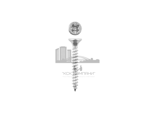 Саморез универсальный белый цинк с потайной головкой и шлицем PZ со средним шагом резьбы и острым наконечником.