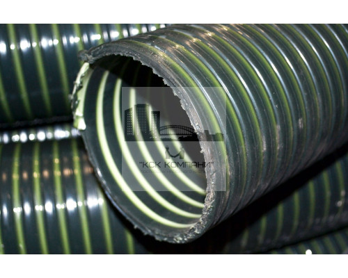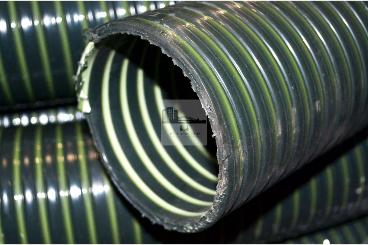 Описание: состоит из цилиндрической оболочки из пластифицированного поливинил хлорида с замоноличенным внутри ее прутком из непластифицированного поливинилхлорида. Внутренняя поверхность шланга гладкая, внешняя - волнистая. Цвет: непрозрачная зелёная стенка, белая спираль. Изготовлены методом последовательной экструзии.